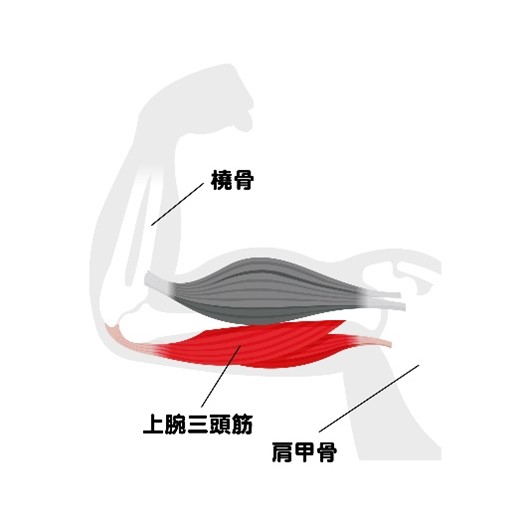上腕三頭筋は上腕二頭筋の裏側にある筋肉で、肘の曲げ伸ばしや物を押す動作、投げる動作、腕の太さに関係しています。ちょうど腕の下にあたる部分のため、「ふりそで」と呼ばれることもある筋肉です。腕の筋肉の中で大きな割合を占めるので、鍛えることで効率よく二の腕を引き締めることができます。