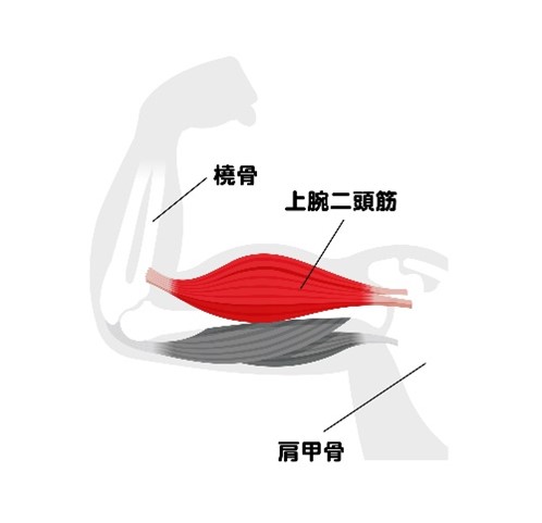 上腕二頭筋は、肘を曲げて拳を握りしめたときに、力こぶにあたる部分の筋肉です。肩から肘に向かってついていて、肘を曲げたり腕を上げたりする動作で使用します。