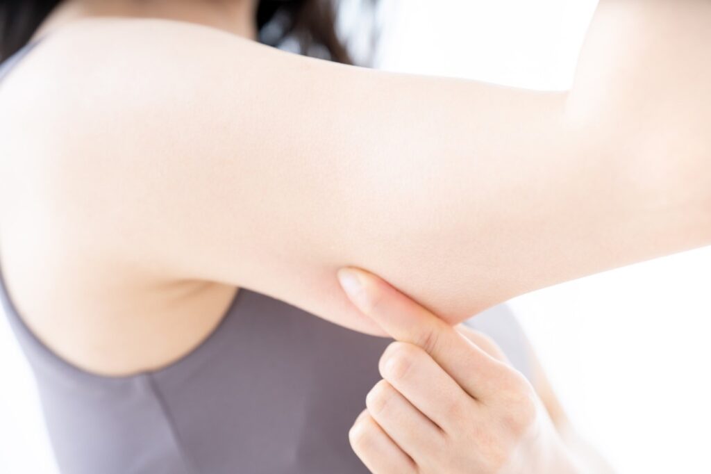 また、血行不良や冷えが起こると、体が脂肪を溜め込みやすくなるため、セルライトがつきやすくなるため注意が必要です。二の腕を触ったときに冷たさを感じる人は、冷えによって血行不良が生じている可能性があります。適度な運動や意識的に二の腕を動かす生活をして、血行を改善しましょう。